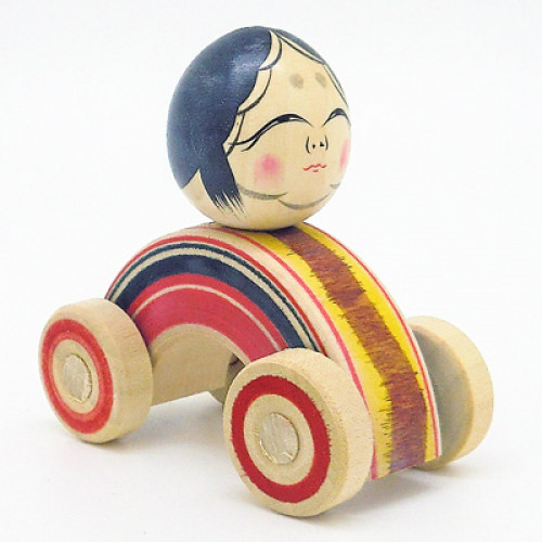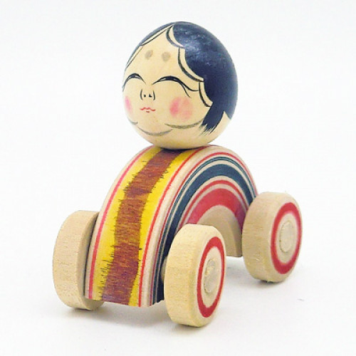 おかめに車輪が付いた木地玩具です